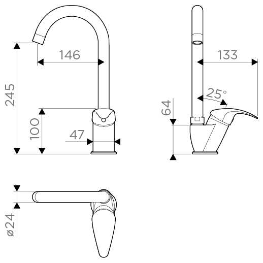 Этот смеситель выполнен в современном стиле, имеет высокий поворотный излив, который может вращаться на 360 градусов. Смеситель имеет ручку в необычной форме, которая напоминает форму листочка, очень гладкая и приятная на ощупь. Угол ее наклона 45 градусов, что для подачи воды очень удобно. Материал корпуса этого смесителя выполнен из высококачественной латуни. Также смеситель имеет керамический картридж и пластиковый аэратор, которому не страшна ржавчина. Визуально кран смотрится очень стильно, интересно и элегантно. Нашему смесителю уже третий год, проблем с ним никаких не было.