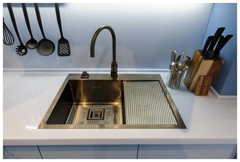 Кухня у нас изготовленна в темных тонах, и в нее надо было купить темный кран, то есть смеситель. Мой взгляд пал модель такого типа, потому что он выглядит очень современно и футуристично, и по дизайну великолепно подходит под мою кухню. Со своими функциями кран справляется великолепно. Напор воды очень плавно регулируется, так же на самом сильном напоре кран вообще не издает шума, что большой плюс, потому что у нас есть маленький ребенок, которому может быть не приятен громкий звук воды. Так что кран был оптимальным решением для нашей семьи. В нем нас все устраивает и мы довольны как качеством воды, так и его износостойкостью.