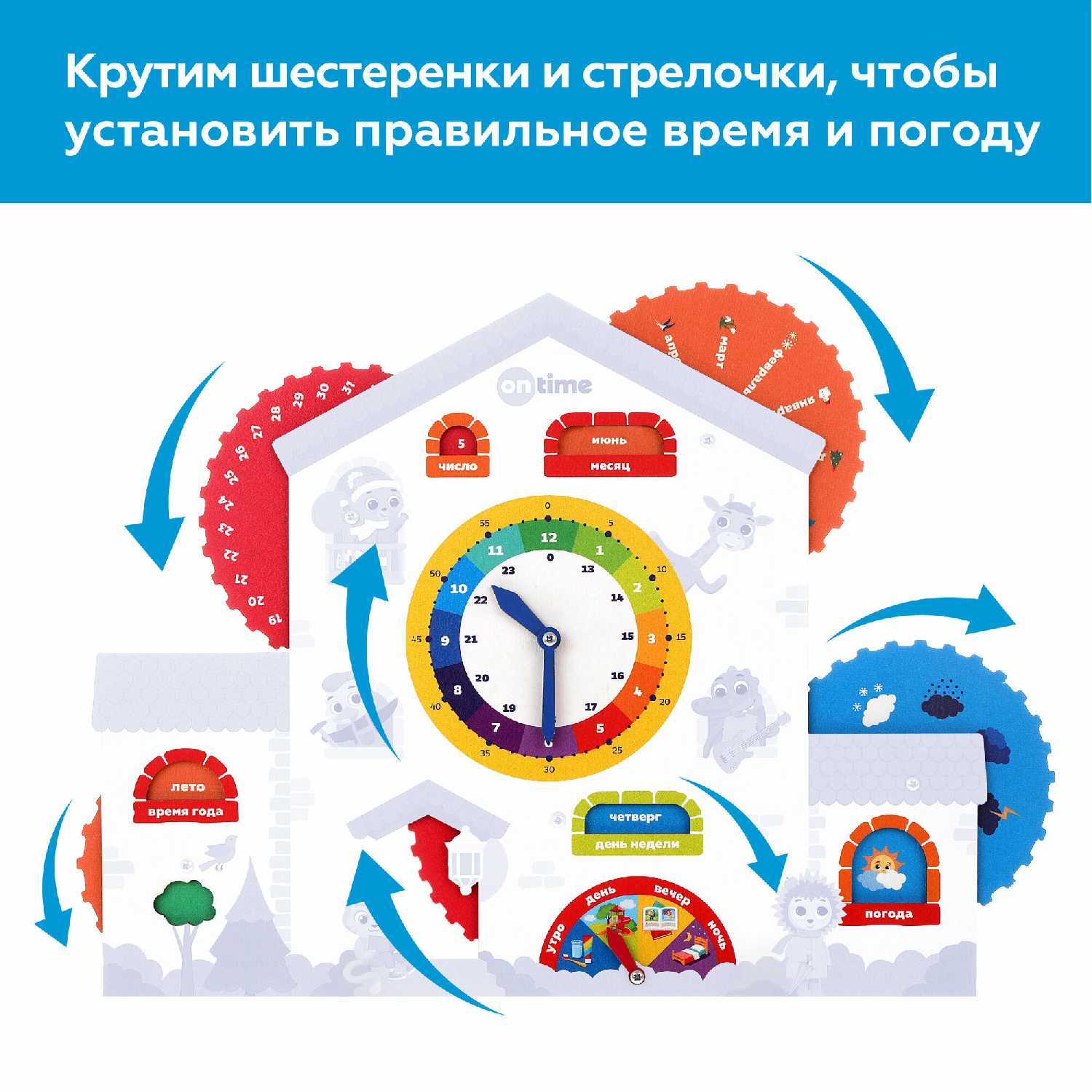 Дополнительная информация : | Вращайте пять шестеренок и выбирайте в «окошке» время года, число, месяц, день недели и погодные условия. Поворачивайте стрелочки и указывайте минуты и часы, время суток. |