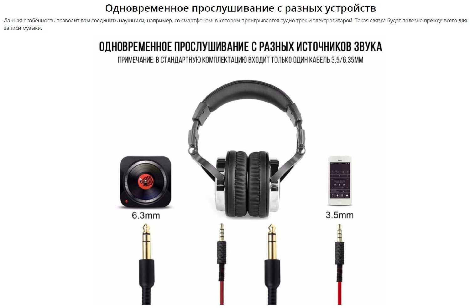 - В комплекте два кабеля: с разъёмами 3.5 мм (с микрофоном) и 6.3 мм (студийный), что позволяет использовать наушники с ПК, телефонами, инструментами.
