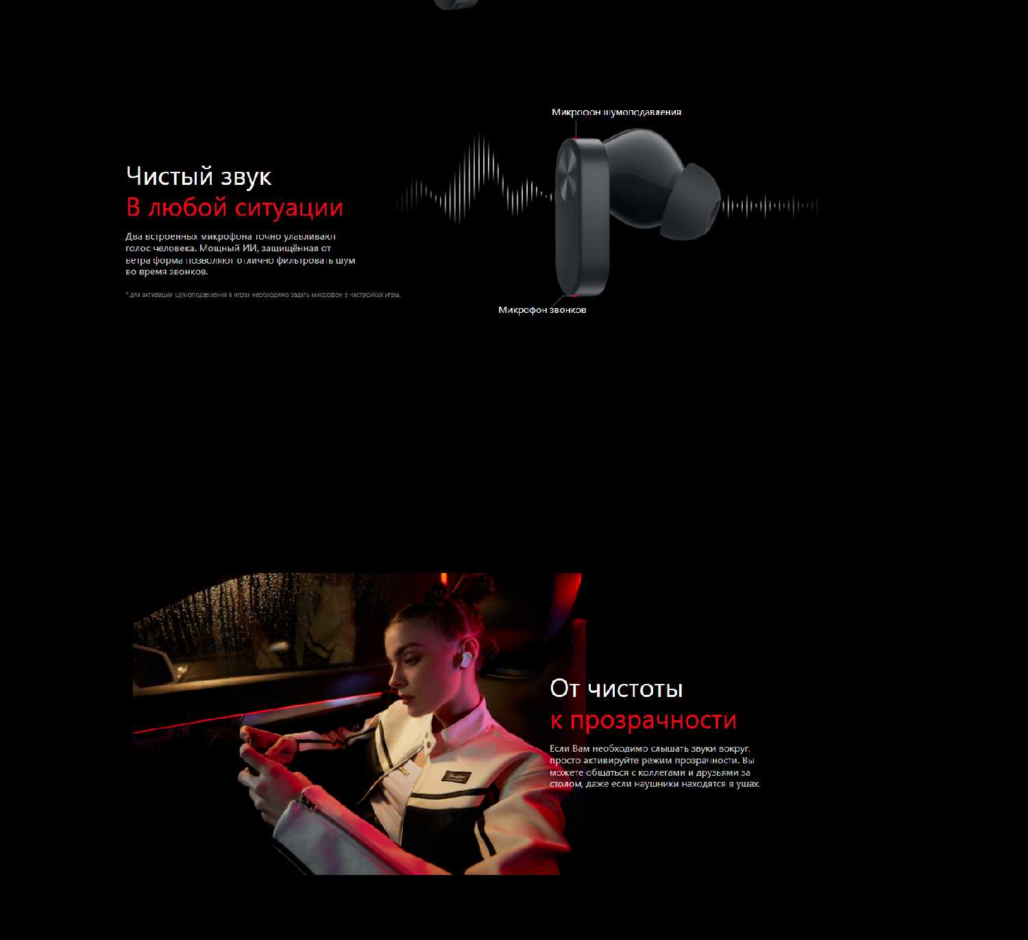 - Два микрофона на каждом наушнике фильтруют фоновые шумы (ветер, городской гул) во время звонков.
