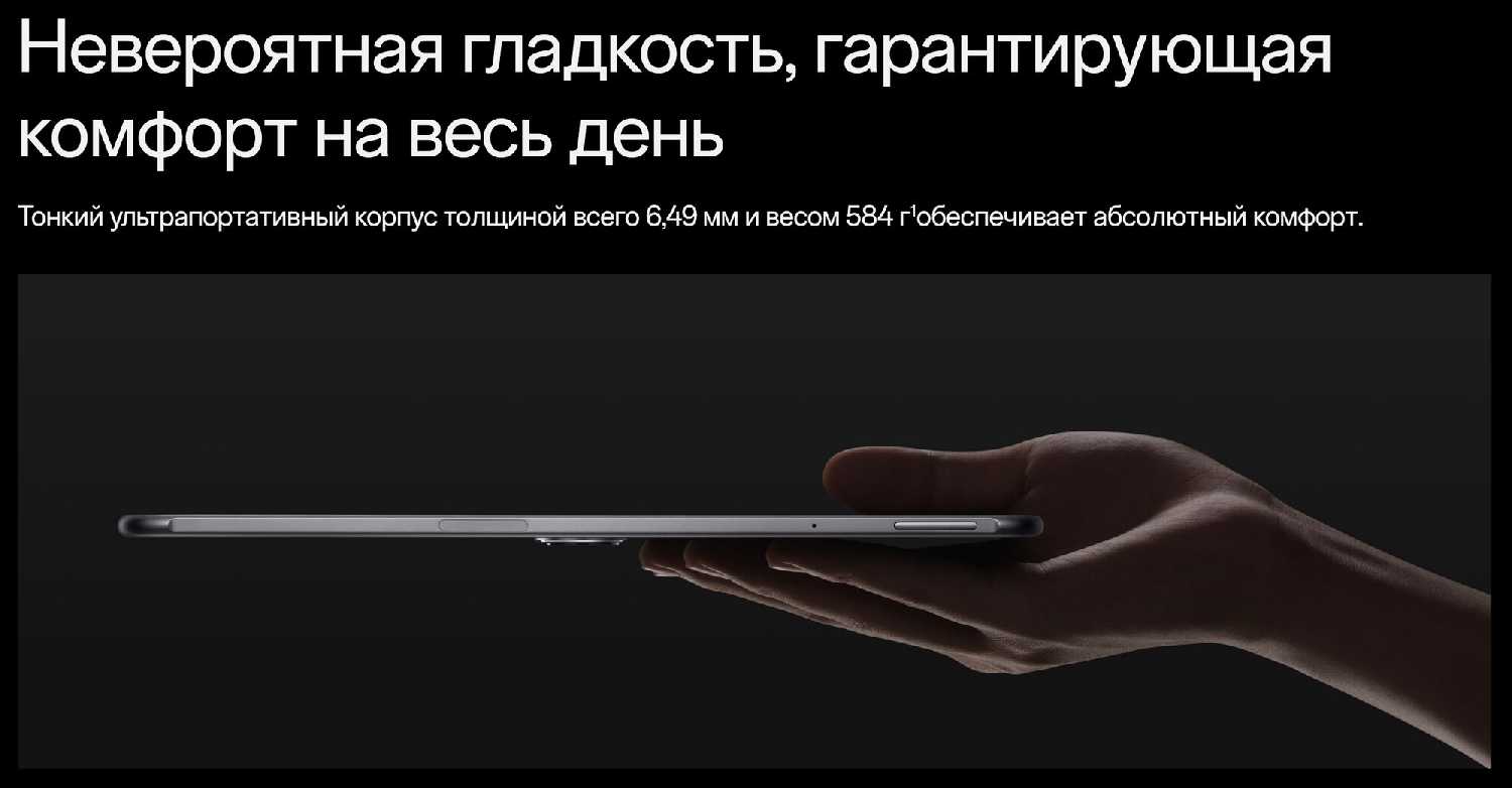 Из-за большого экрана и веса около 580 г планшет ощущается тяжелым для длительного держания в руках, особенно в играх, где рекомендуют использовать подставку или стол. Металлический тонкий корпус удобен в хвате, но с чехлом вес увеличивается до 750 г, что усиливает нагрузку. Пользователи советуют ложе или сидячее положение для комфорта. Для коротких сессий это нормально, но для долгих — лучше с аксессуарами. -