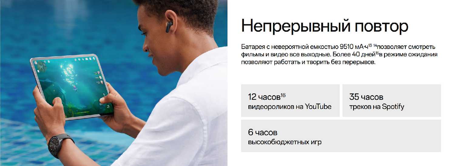 - Аккумулятор на 12140 мАч держит 10–14 часов экранного времени (4 дня при легком использовании без игр), с умной зарядкой для предотвращения перезаряда.