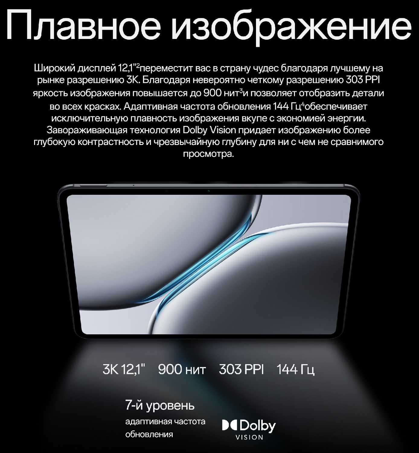 Качество экрана: Экран 12,1 дюйма с разрешением 3K и частотой 144 Гц обеспечивает плавную прокрутку и анимацию, что хвалят 70% пользователей. IPS-матрица яркая (достаточно для помещений), с хорошей цветопередачей, но не AMOLED — 15–20% отмечают отсутствие глубокого черного и возможного выгорания как плюс. Без ШИМ экран безопасен для глаз: пользователи, перешедшие с Samsung Galaxy Tab S9, сообщают об отсутствии усталости после длительного просмотра. Соотношение сторон 7:5 вызывает черные полосы в видео 16:9 — это минус для 25% рецензентов, теряющих до половины пространства при фильмах. Игры тоже страдают: не все адаптированы, показывая полосы или требуя разделенного экрана. Яркость достаточна для YouTube и TV, но в HDR-контенте ограничена. Олеофобное покрытие слабое — пальцы оставляют следы, и 10% рекомендуют сразу клеить пленку. Четкость высокая для чтения и рисования со стилусом (докупается отдельно). Пользователи для работы ценят большой размер как замену ноутбуку. Единичные жалобы на отсутствие HDR, но калибровка из коробки приятная. Для фильмов экран удобен дома, но неидеален для кинематографического формата 2.35:1. 60% считают его одним из лучших в классе за плавность и размер. Разрешение не всегда оптимально для современных игр, но обновления могут исправить. В целом, экран подходит для мультимедиа, но требует привыкания к формату.