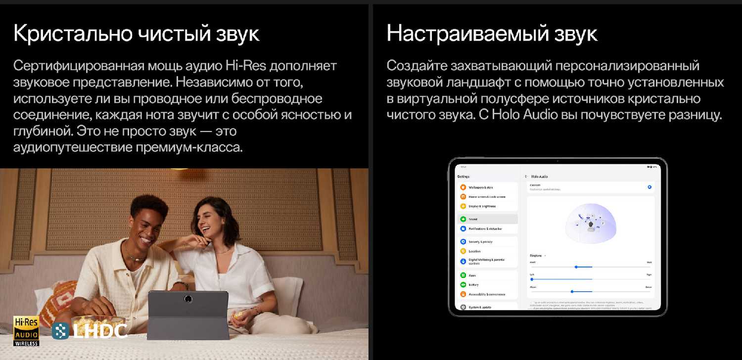 Звуковая система: Восемь динамиков обеспечивают громкий и объемный звук, превосходящий Xiaomi Pad 5/6S Pro — 90% пользователей называют его "как в ноутбуке". Предустановленный эквалайзер работает во всех приложениях, включая игры, без переключений. Качество Hi-Res Audio и кодеки (aptX, LDAC) идеальны для дорогих наушников — детализация на уровне. Громкость выше, чем у смартфонов вроде OnePlus Pura 70 Ultra, что заметно в фильмах. Звук чистый, без искажений на максимуме, бас насыщенный. Для музыки и видео 75% хвалят как преимущество над конкурентами. В тихой комнате динамики не раздражают, но в шумных — помогают. Пользователи для досуга отмечают удовольствие от просмотра без внешних колонок. Минус: нет отдельных настроек эквалайзера для всех сценариев, но базовые пресеты достаточны. Сравнивая с Huawei MediaPad M5, звук здесь более сбалансированный. Для игр PUBG аудио помогает в позиционировании. Долгосрочное использование (месяцы) не выявляет деградации. 5% жалуются на отсутствие Dirac-подобной обработки, но общий вердикт положительный. Звук делает планшет идеальным для мультимедиа дома. В наушниках кодеки на месте, без потерь качества.