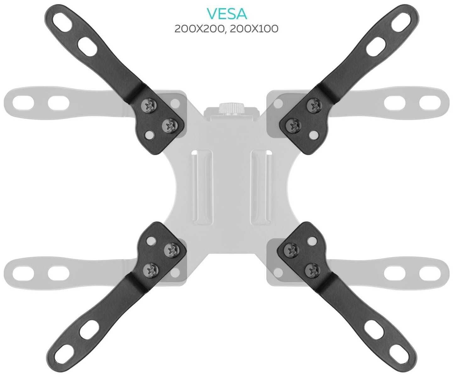 - Горизонтальное и вертикальное крепление планок обеспечивает гибкость при установке на мониторы и ТВ с прямоугольным VESA (400×200 мм).