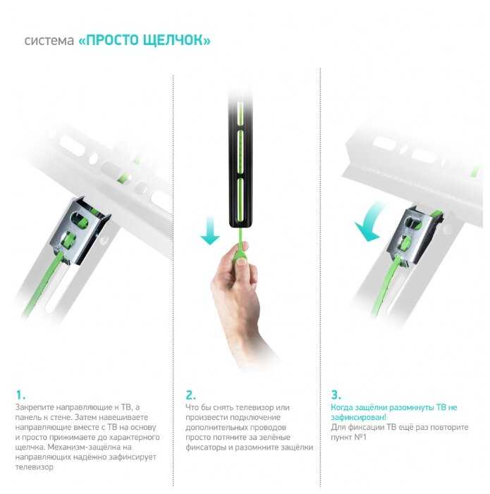 - Удобные хвостики-защелки для фиксации планки на ТВ без отвертки.