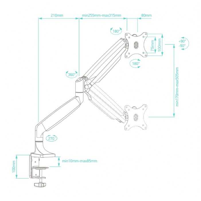 - + Главное достоинство кронштейна заключается в наличии пружинного механизма, который уравновешивает силу гравитации. Регулировочный винт позволяет уравновесить массу монитора, что дает возможность менять положение монитора в 3D пространстве легким движением руки.