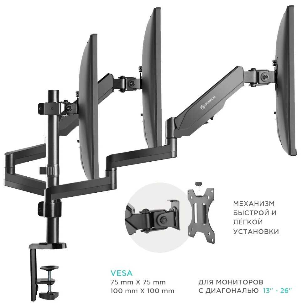 - Два вида крепления (струбцина и через отверстие в столе) позволяют адаптировать под разные поверхности, обеспечивая стабильность для конфигураций с несколькими мониторами.