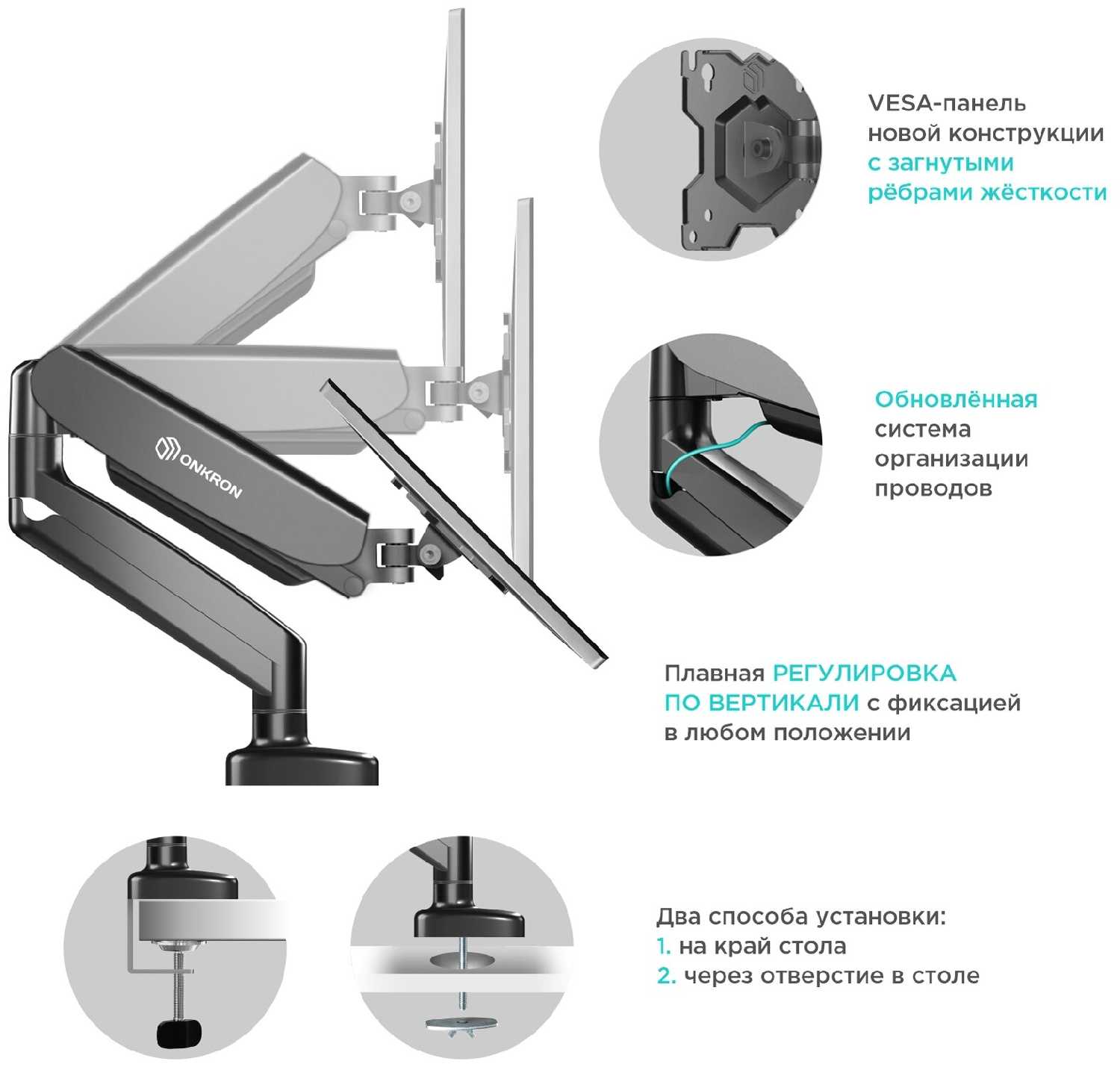 - Гибкая регулировка положения монитора с сохранением устойчивости: