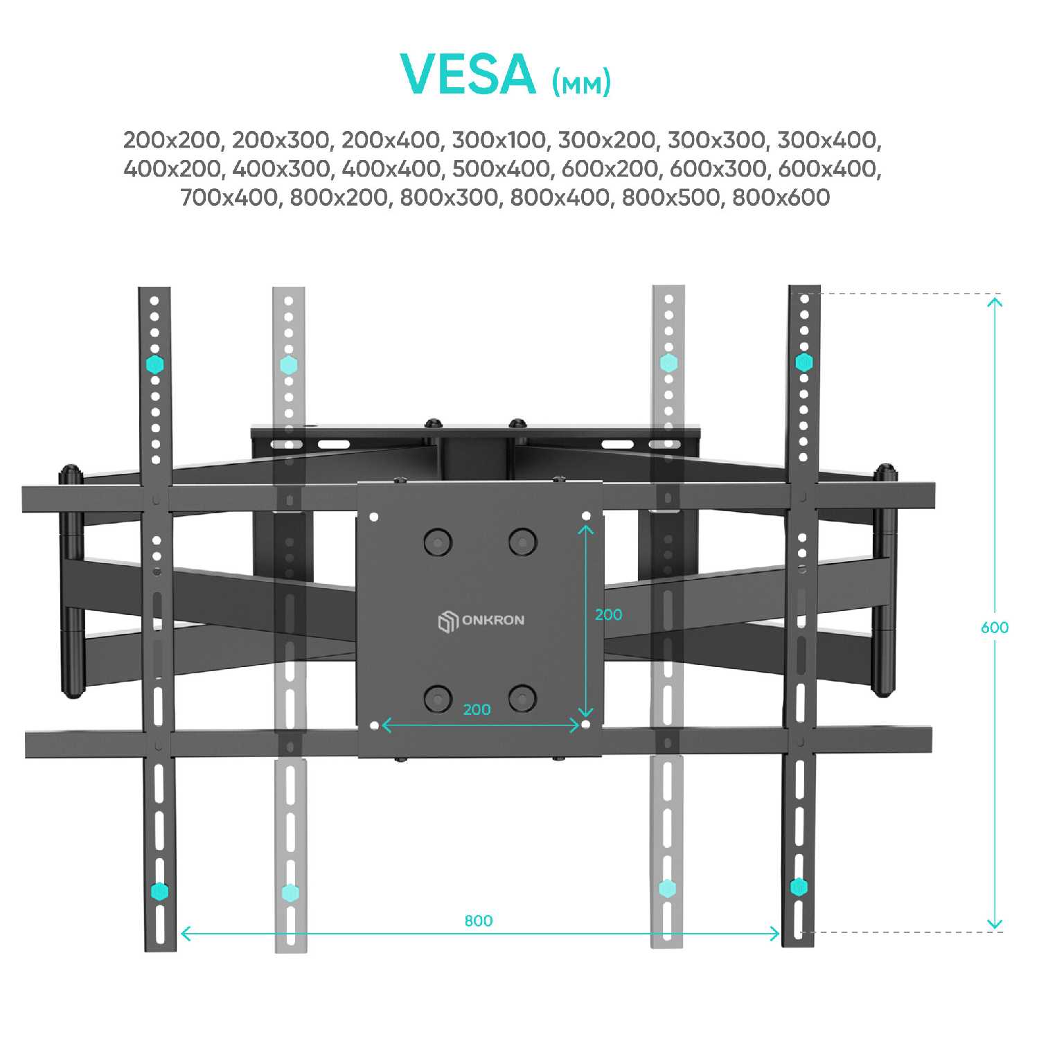Стандарт крепления VESA : | 100x100 мм, 100x200 мм, 200x100 мм, 200x200 мм, 300x100 мм, 300x200 мм, 300x300 мм, 300x400 мм, 400x200 мм, 400x300 мм, 400x400 мм, 500x400 мм, 600x200 мм, 600x300 мм, 600x400 мм, 600х600 мм, 800x600 мм |