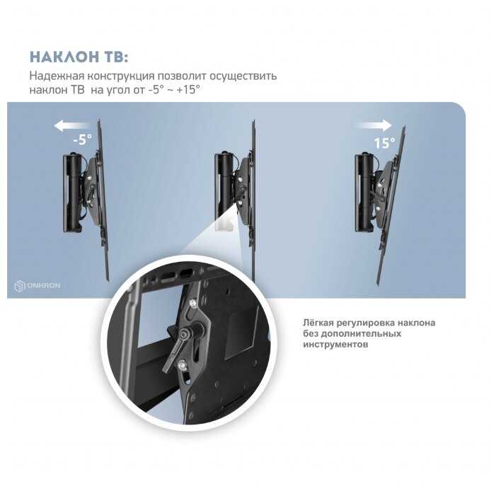 Кронштейн Onkron — специализированное решение для тех, кто ценит гибкость в размещении телевизора. Его ключевое преимущество — возможность поворота на 180° и вылет до 70 см, что идеально для студий, кухонь-гостиных и помещений с нестандартной планировкой. Конструкция из толстой стали с усиленными шарнирами обеспечивает безопасность даже для тяжелых моделей (до 55 кг), но только при условии замены штатного крепежа на анкера или химические дюбели.