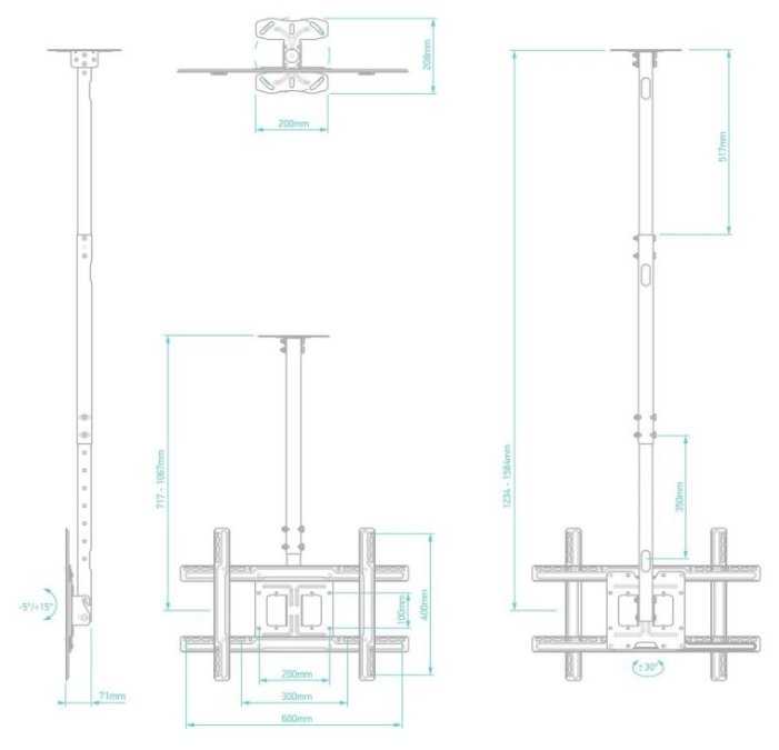 - Регулируется высота (до 3 секций штанги для потолков 3,7 м), наклон для просмотра с кровати.