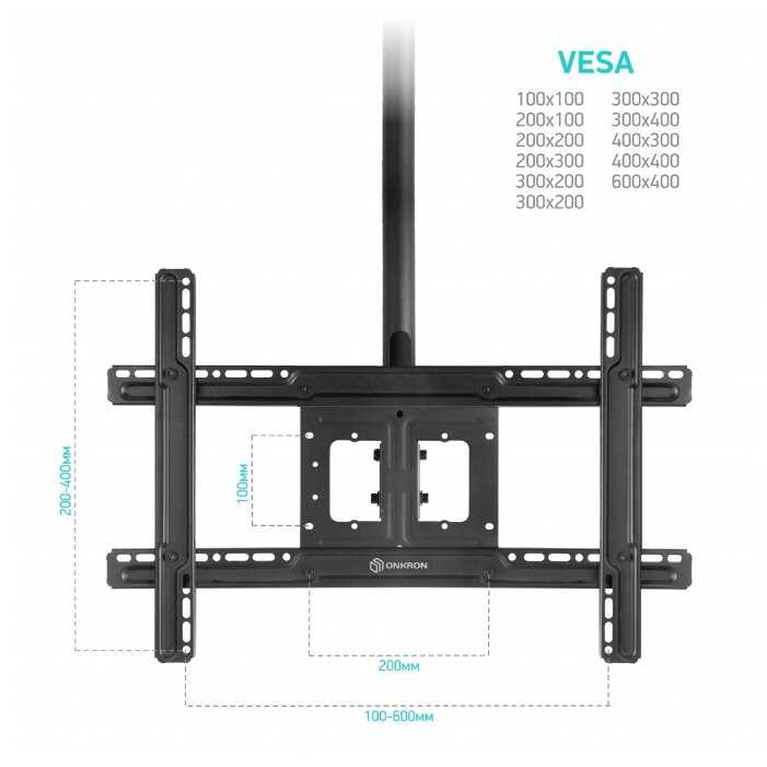 Стандарт Vesa : | 100x100 мм, 200x100 мм, 200x300 мм, 300x200 мм, 200x200 мм, 300x400 мм, 300x300 мм, 200x400 мм, 400x200 мм, 500x400 мм, 400x300 мм, 400x400 мм, 600x400 мм, 300x100 мм, 600x200 мм, 600x300 мм |