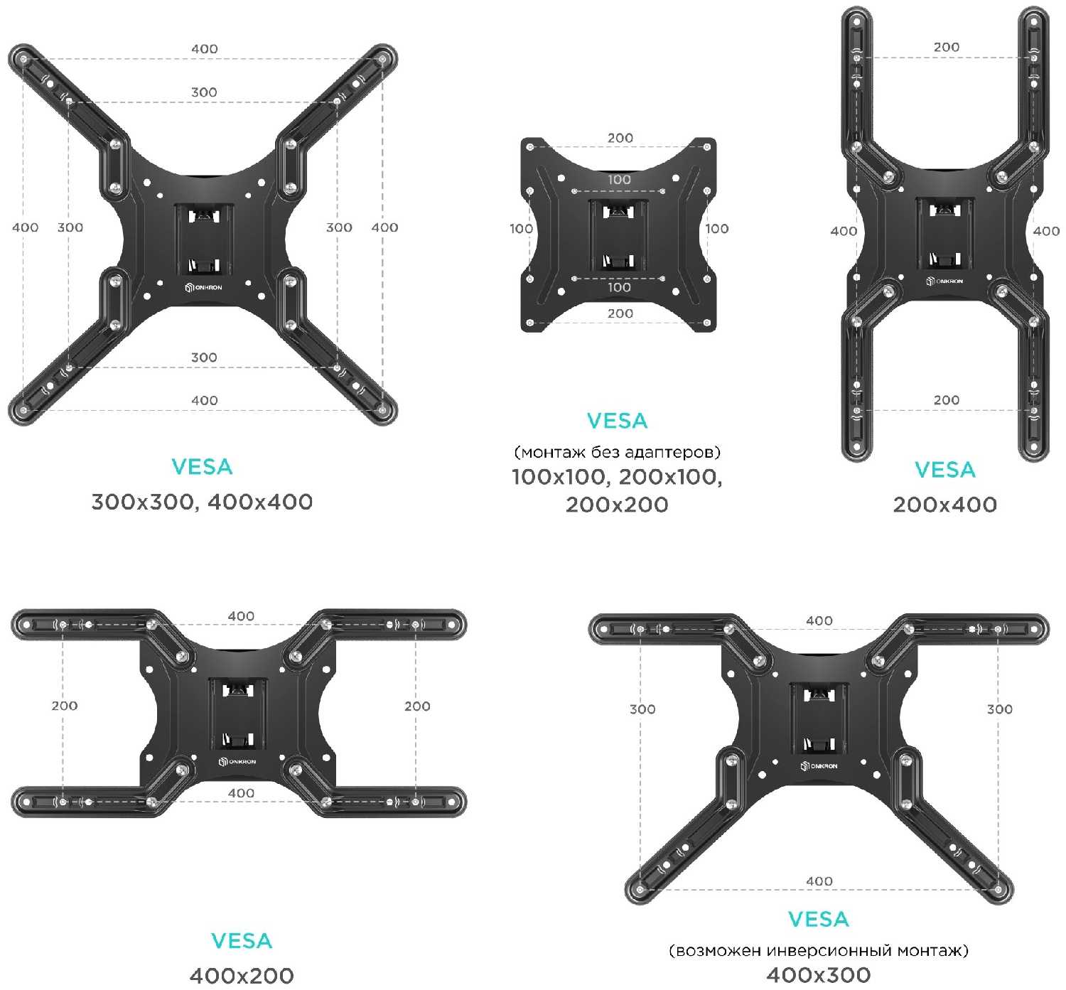 Стандарт Vesa : | 100x100 мм, 200x100 мм, 200x300 мм, 300x200 мм, 200x200 мм, 300x300 мм, 200x400 мм, 400x200 мм, 400x300 мм, 400x400 мм |