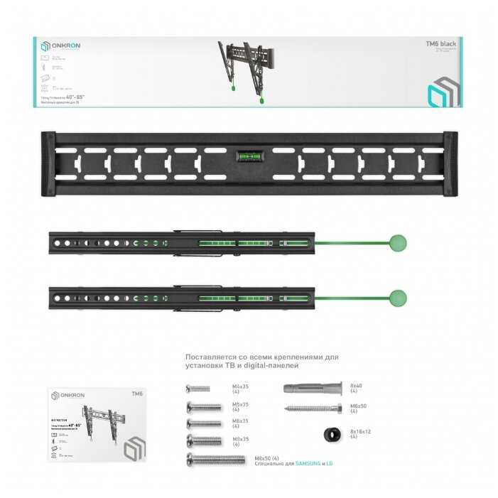 - + В наборе есть абсолютно всё необходимое для монтажа: болты разных размеров ( М4, М8), дюбели, саморезы и даже уровень для точной установки. Удобная защёлка на направляющей значительно упрощает процесс крепления телевизора.