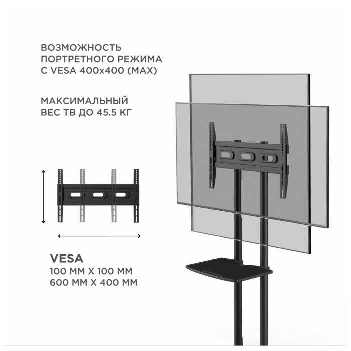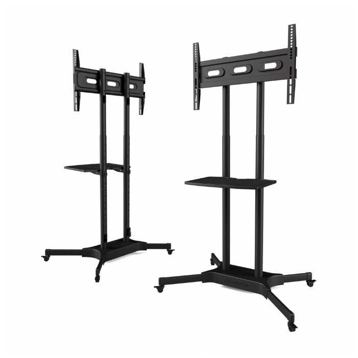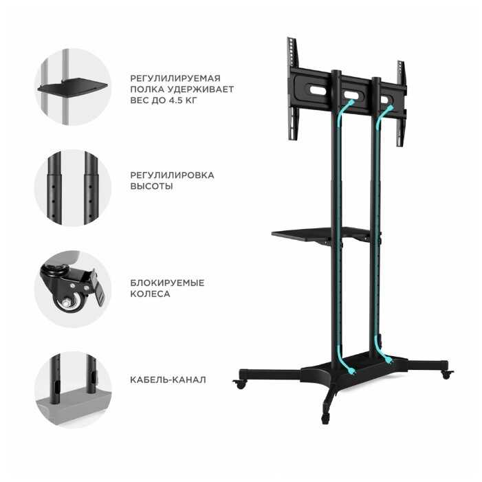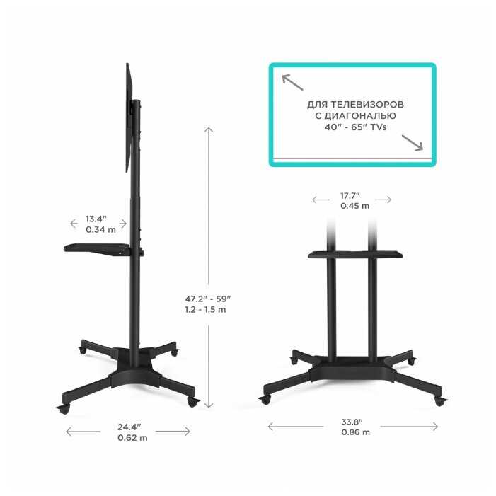 - Высота настраивается, подходит для диагоналей от 40 до 100 дюймов, телескопические ножки упрощают установку.