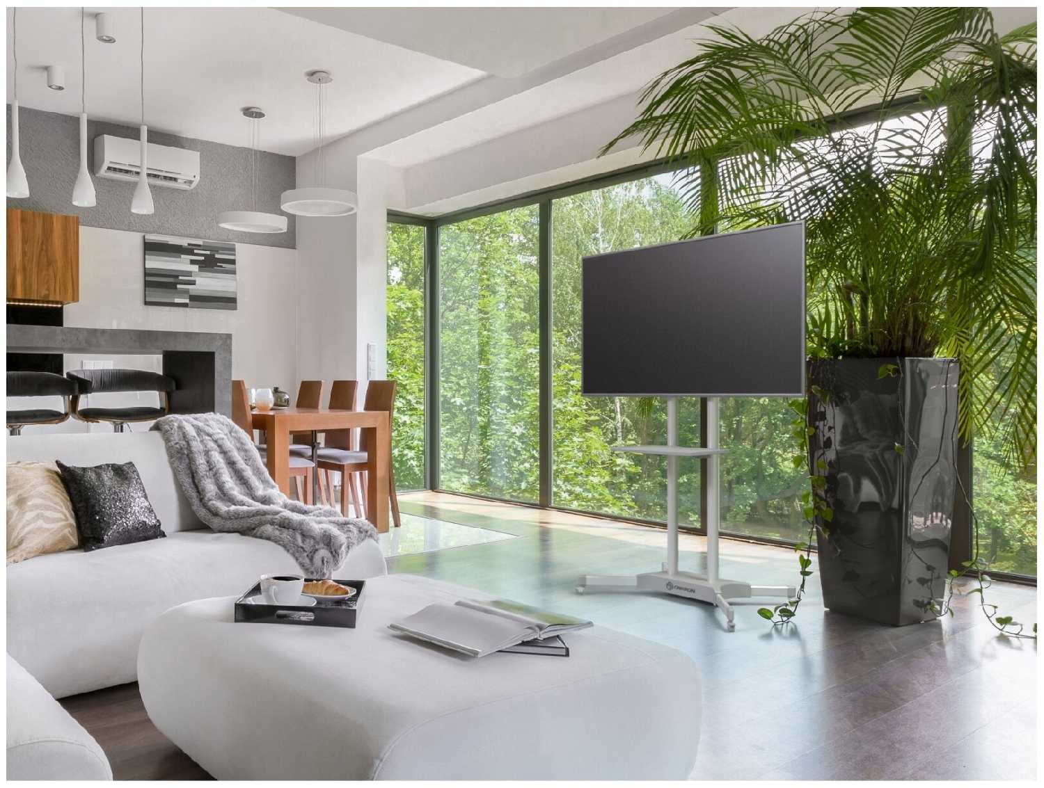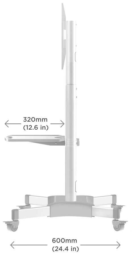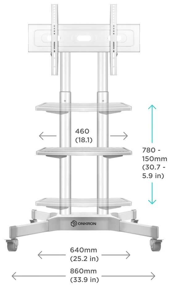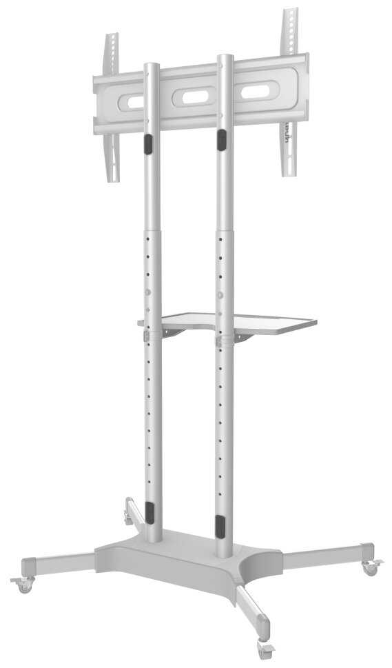 Смотрится эстетично, функционально со всеми полочками и кабель-канатами, тормозами на колесах. Телевизор поставил 65 диагонали