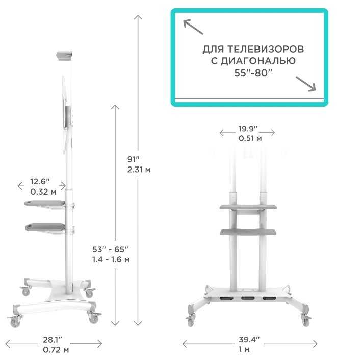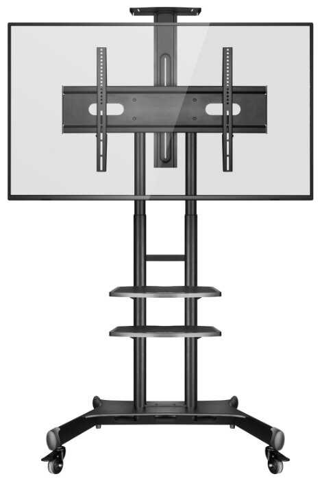 Покупалась в конференц-зал в офис, под телевизор 75 дюймов и весом 40 кг. Монтируется легко, держит крепко, катается по полу мягко и почти без усилий. Удобные полочки под оборудование.