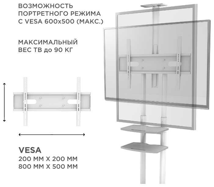 Брали для тв 75 дюймов. Держит здорово. Наличие полочек и приспособ для оборудования вкс