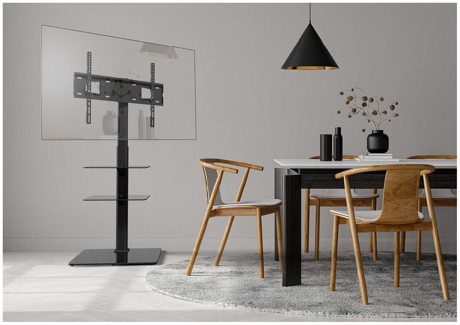 Чёрный матовый металл и тёмное стекло гармонично вписываются в современные стили (лофт, хай-тек, минимализм). В классических интерьерах стойка может выглядеть чужеродно из-за глянца и геометричной формы. Размеры компактны — занимает на 30% меньше места, чем традиционные ТВ-тумбы. -
