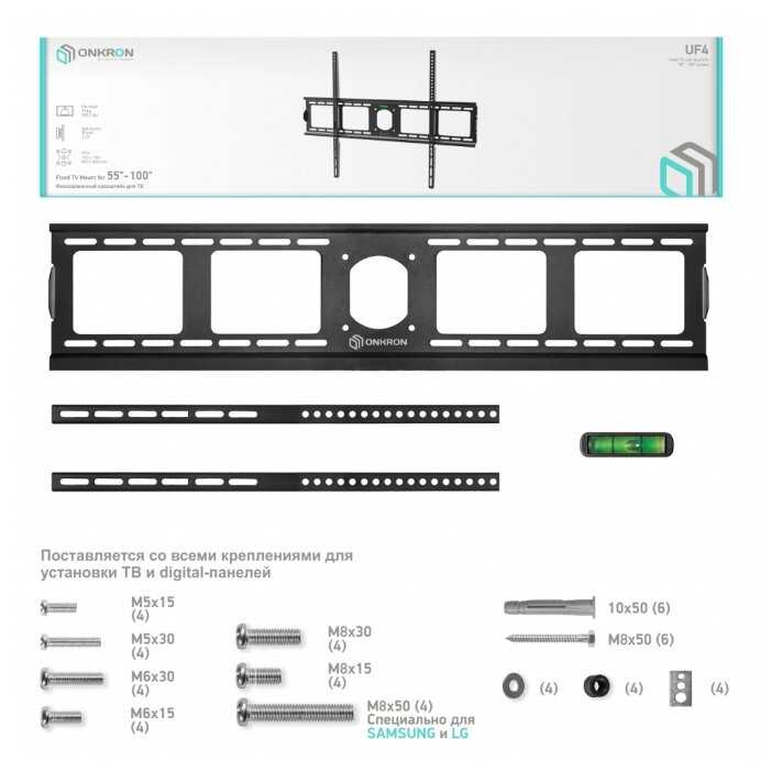 - Регулировка по высоте позволяет монтировать экраны от 32 до 100 дюймов, пользователи успешно вешали модели 65-85 дюймов без доработок.