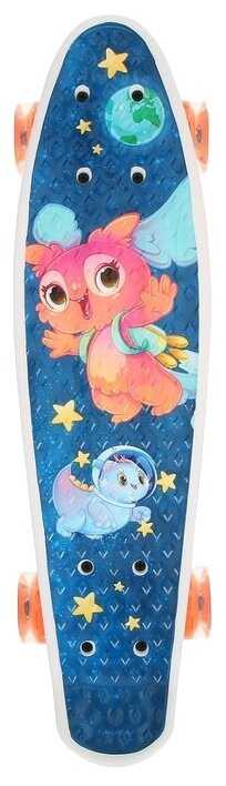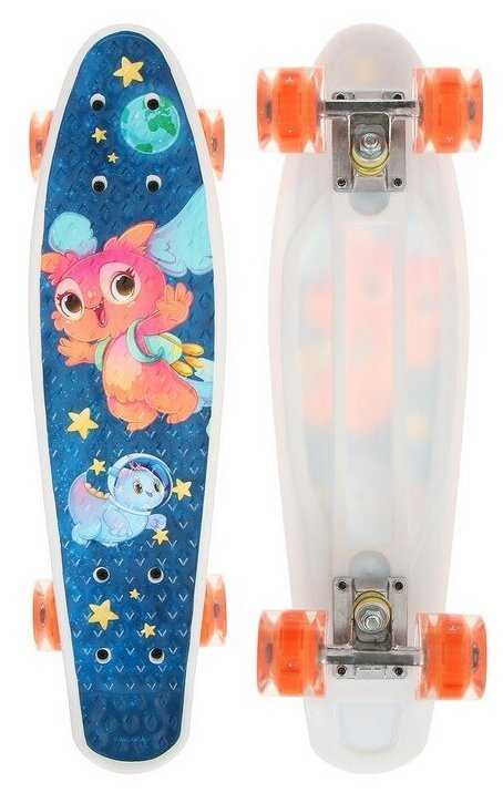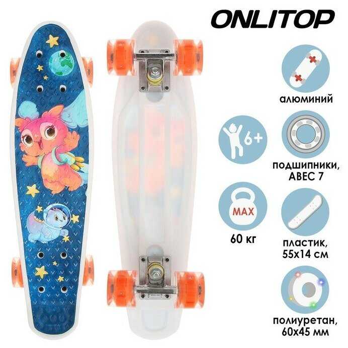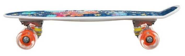 | Дополнительная информация : | пенниборд с алюминиевой рамой, колёса светятся при движении, подходит для детей от 6 лет, максимальная нагрузка 60 кг, материал деки - пластик, колёса из полиуретана, подшипники ABEC 7 |