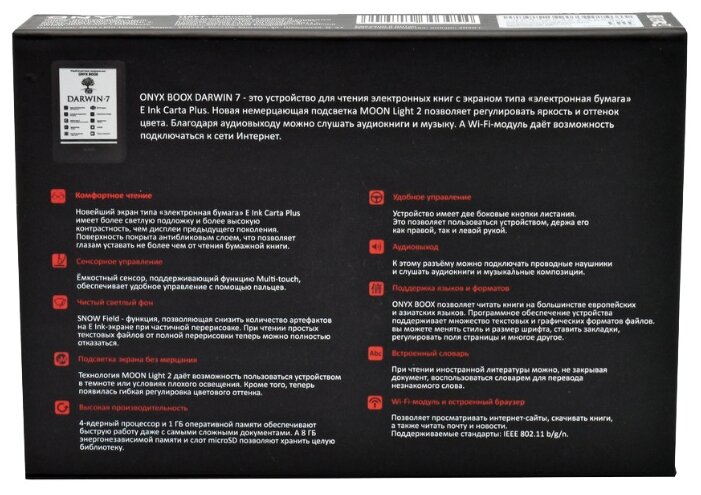Дарвин не умеет (за 11 тысяч!!!) Отмечать прочитанные книги. Ему совсем плевать на то, что вы даже реально прочитаете книгу, то есть до 100 процентов доведете. Никакой галочки, никакой пометки. А теперь поймите еще одну вещь. В дарвине при просмотре папок, если у вас файл называется сперва фамилией автора и именем, затем названием цикла, затем названием романа, то учтите, что всю эту инфу в превью вы не увидите. Короче, это дико неудобно. У покета есть возможность просто выделить книгу и поставить галочку о прочтении. И это в самых бюджетниках. Дарвин за 11 к этого не умеет. А техподдержка оникса пожимает плечами, они даже не знают, что 100 не ставят галочку в книге (общался с ними вк и по почте). Увы. Сдал книгу.