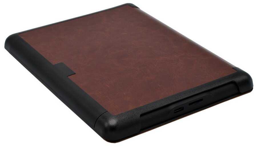 - Компактный размер (6 дюймов) и вес устройства позволяют держать его одной рукой длительное время без усталости. Чехол с магнитной фиксацией и кнопками перелистывания интегрирован в конструкцию, что упрощает навигацию.