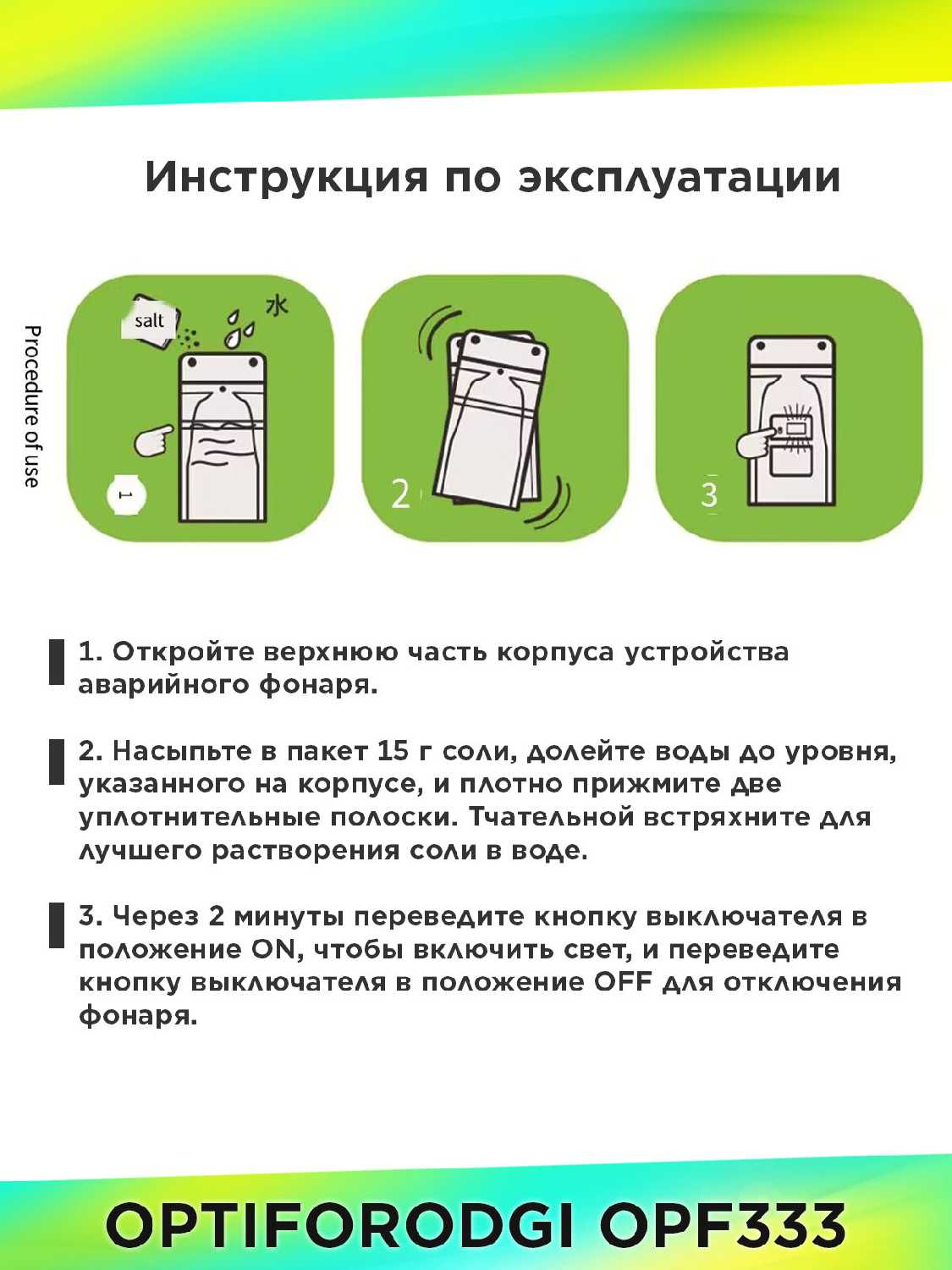 Я в восторге от этого фонарика! Он очень удобный и компактный, а главное — не требует батареек или зарядки. Просто добавьте солевой раствор, и он готов к использованию. Я часто хожу в походы и знаю, как важно иметь надёжный источник света. Рекомендую!!