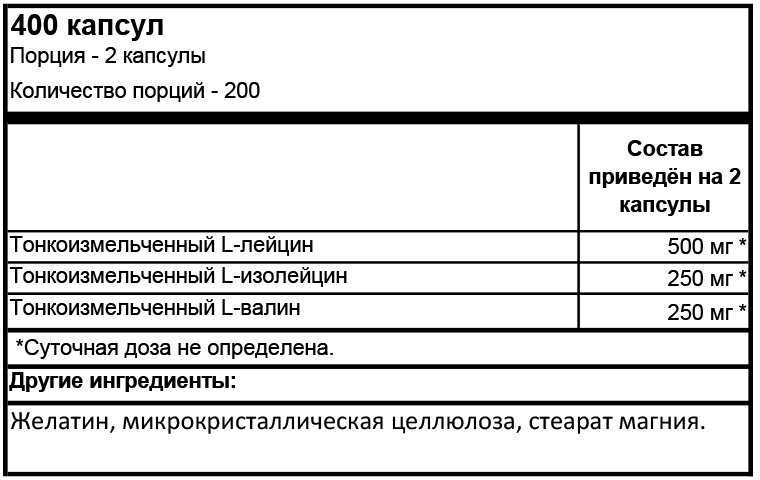 Дополнительная информация : | в 1 порции (2 капсулы) содержится: L-лейцин - 500 мг L-изолейцин - 250 мг L-валин - 250 мг, размер порции в капсулах/таблетках: 2, назначение: принимайте по 2 капсулы между приёмами пищи за 35-45 минуты до тренировки и/или сразу после тренировок, предназначено для потребления здоровыми взрослыми людьми в качестве составляющей здоровой сбалансированной диеты и физических упражнений, рекомендации по применению: принимайте 1 порцию 1–3 раза в день запивая водой или Вашим любимым напитком, состав: l-лейцин l-изолейцин l-валин желатин микрокристаллическая целлюлоза стеарат магния |