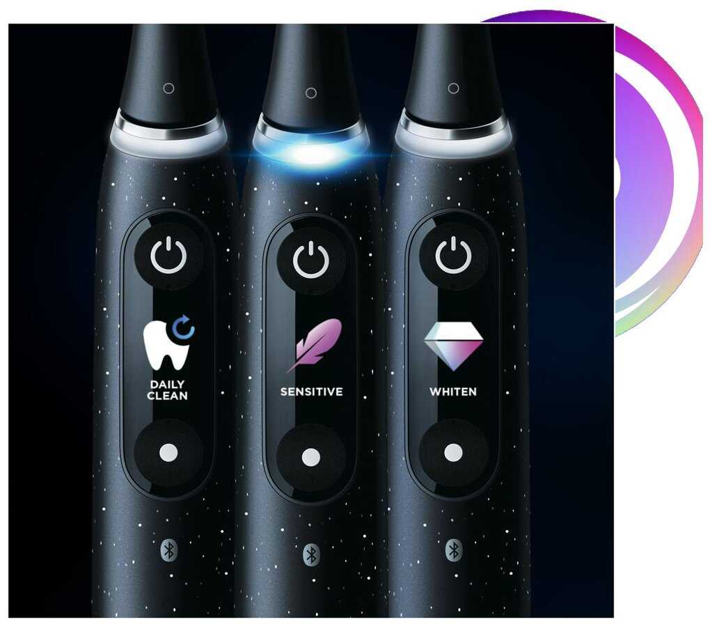 - 6 режимов (включая Sensitive для чувствительных зубов) адаптируют интенсивность чистки под конкретные потребности.