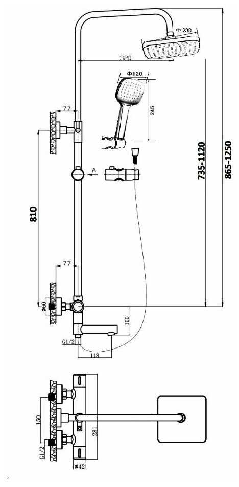 | @Комплектация : | душ стойка, ручной душ, верхний душ, шланг, набор для подключения, инструкция, смеситель |