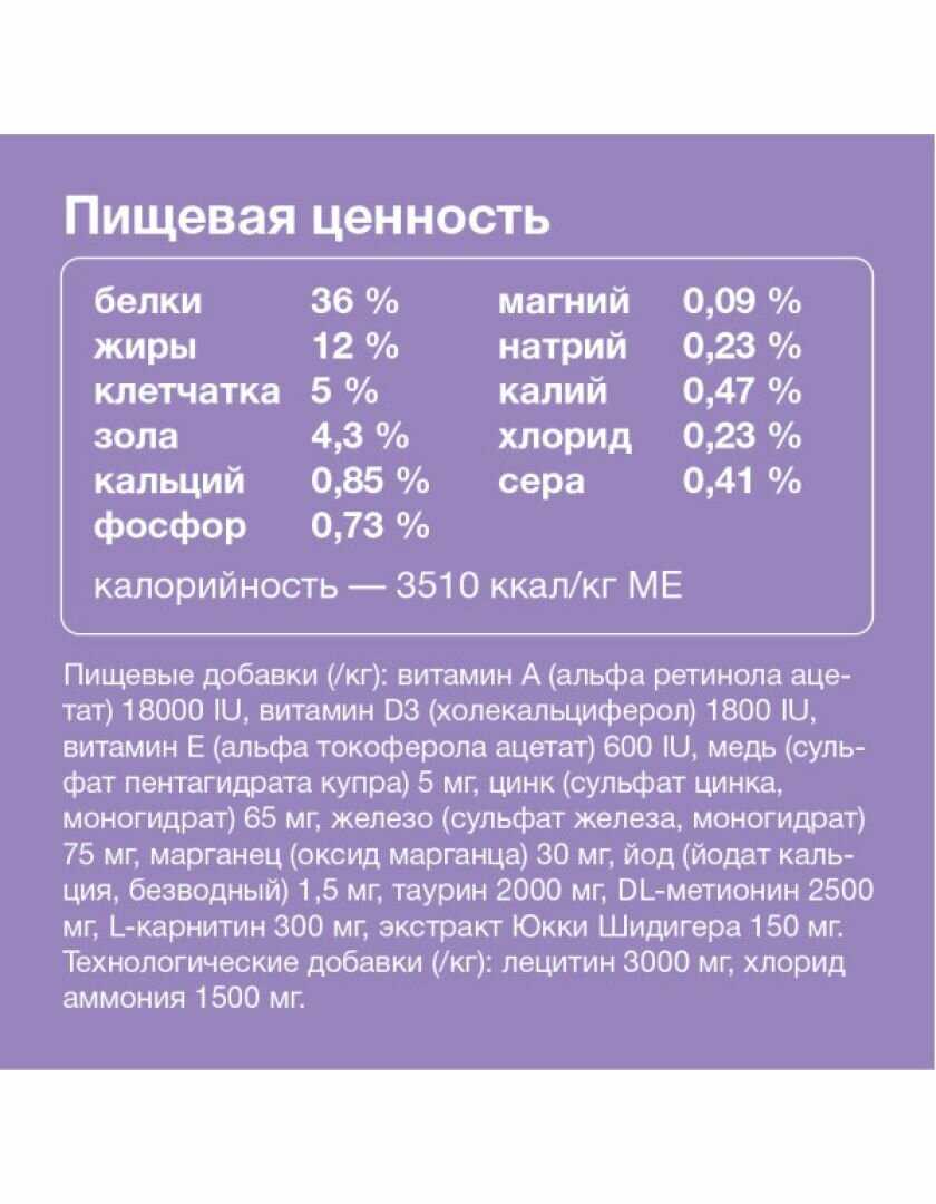 Витамины : | на 1 кг: А (ретинилацетат) 18 000 мг/кг, D3 (холекальциферол) 1 800 мг/кг, Е (альфа-токоферилацетат всех раков) 600 мг/кг, таурин -2000 мг, DL-метионин - 2 500 мг, L-карнитин - 300 мг, экстракт Юкки Шидигера - 150 мг, лецитин - 3 000 мг |