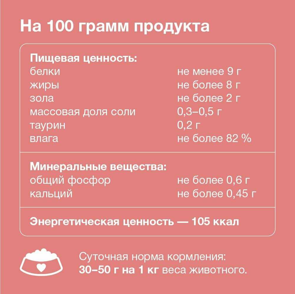 | Пищевая ценность : | белки - не менее- 9, 0 %, жиры - не более 8, зола - не более 2, массовая доля соли - 0, 3-0, 5 %, таурин - 0, 2 %, влага - не более 82, 0% |