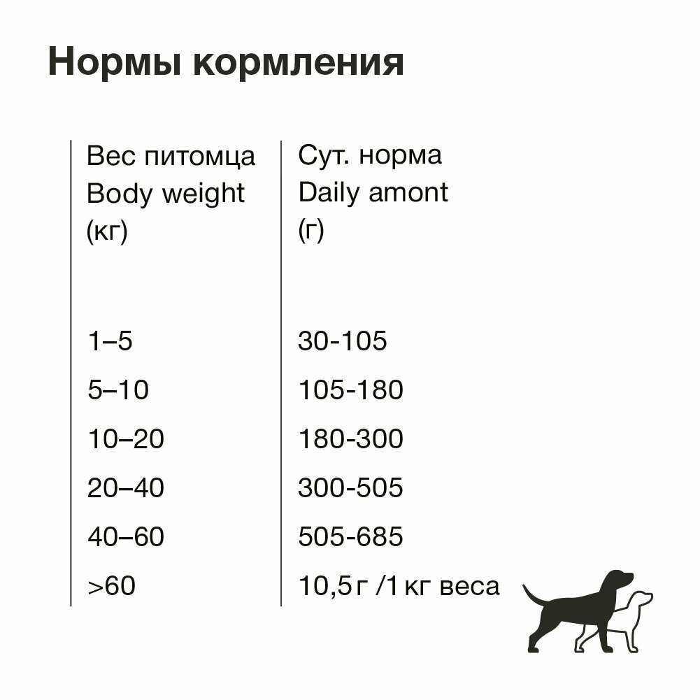 - Поддержание стабильного энергетического уровня и активности собаки без набора лишнего веса при соблюдении норм кормления, что указывает на оптимальную калорийность.