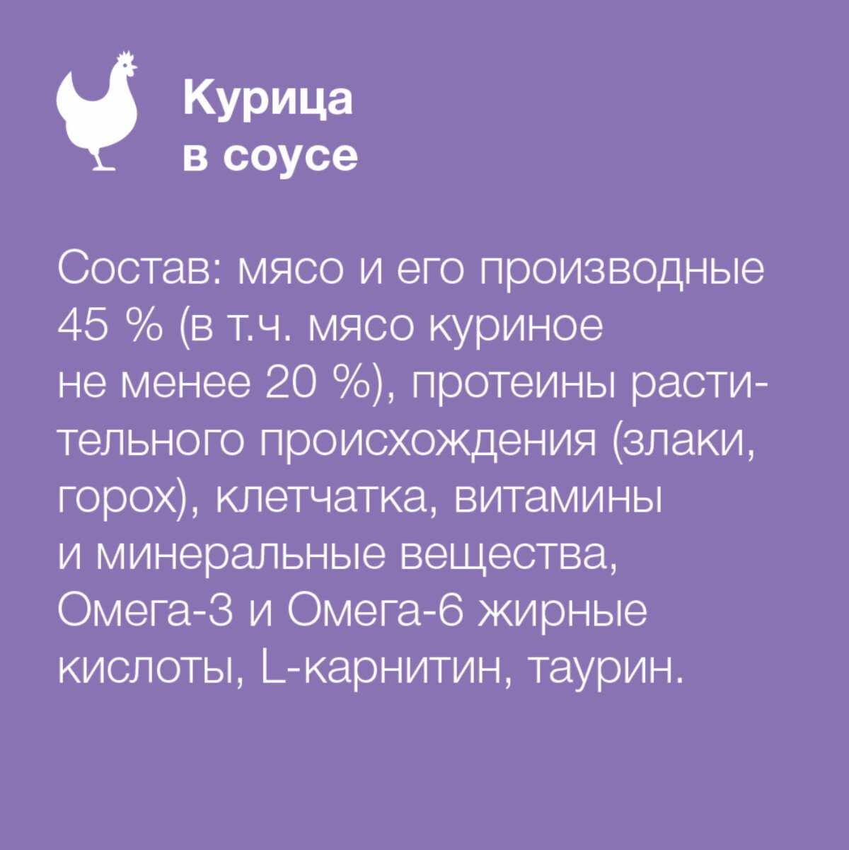 | Консистенция корма : | кусочки в желе, кусочки в соусе |