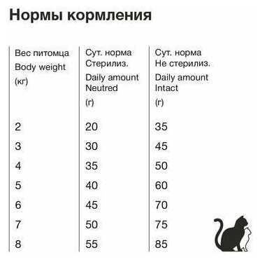 Особые потребности : | гипоаллергенный, для живущих в помещении, для живущих на улице, для здоровья кожи и блеска шерсти, для здоровья костей и суставов, для стерилизованных/кастрированных, при чувствительном пищеварении, профилактика МКБ, профилактика зубного камня |