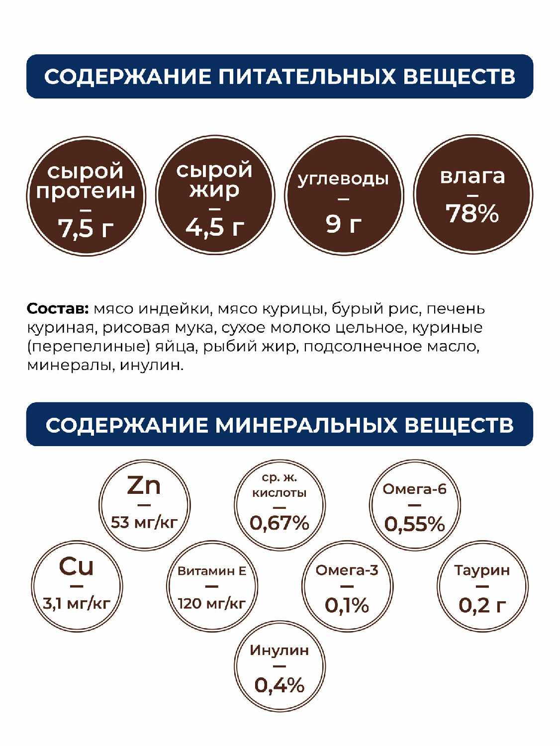 | Консистенция корма : | кусочки в бульоне, кусочки в соусе, паштет |