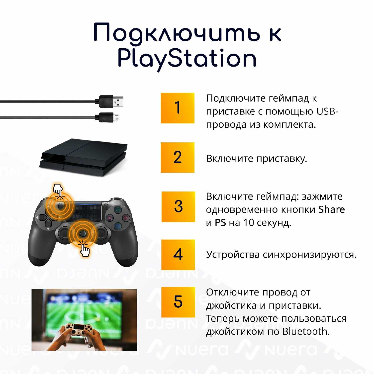 Геймпад успешно подключается и распознается консолью Sony, часто даже отображаясь в системе как оригинальный контроллер. Все основные кнопки, включая сенсорную панель и гироскоп, функционируют. Однако для стабильной беспроводной игры на PS рекомендуется использовать адаптер из комплекта, так как прямое Bluetooth-соединение с консолью может работать менее стабильно и иногда провоцировать кратковременные разрывы связи. -