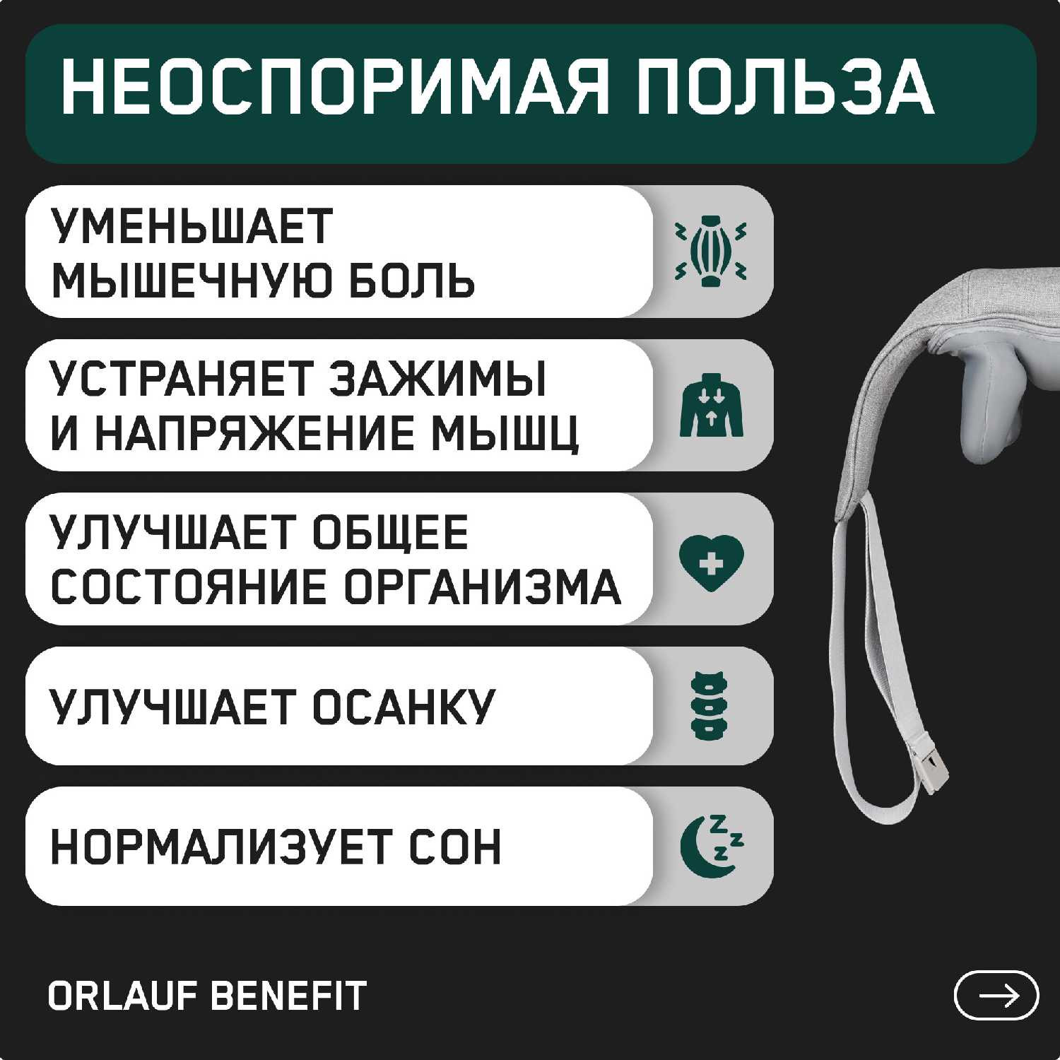 - + Массажирует неожиданно сильно. В роликах в тик токе как-будто поглаживает, но это иллюзия. Прямо хороший глубокий массаж. И больше и тяжелее, чем на картинке. Но все это мелочи, ведь у меня уже не было такого хорошего сна и головную боль он снимает прекрасно. А еще им хорошо бедра массажировать. Кнопки расположены удобно. Их всего три – включение, прогрев и регулировка. Можно его укрепить на плечах, держится хорошо. Так что это классный массажер, берите не сомневайтесь!
