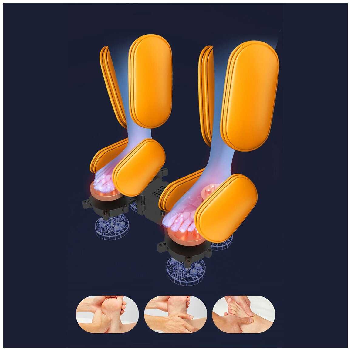 В выдвижной подножке встроены вращающиеся ролики для акупунктурного воздействия на стопы и валики для икр. При переходе в горизонтальное положение подножка автоматически выдвигается на 15 см. Пользователи особо хвалят комбинацию с подогревом — это снимает усталость после физических нагрузок. -