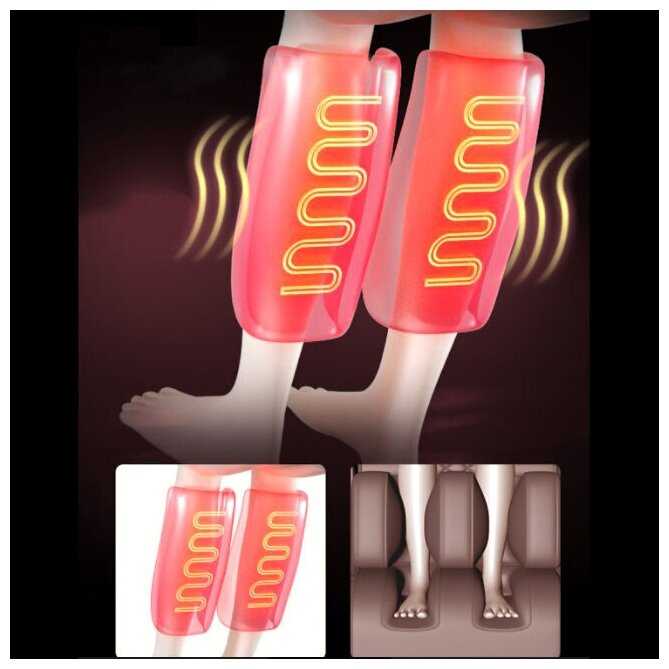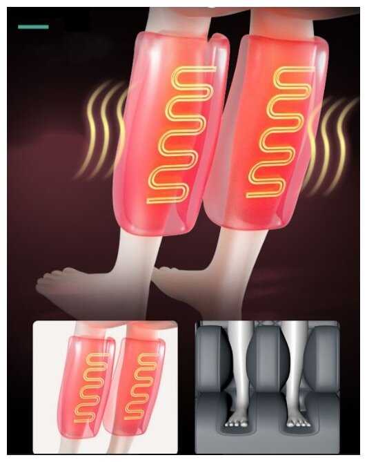Функция прогрева ощущается в поясничном отделе и стопах, но почти не чувствуется в икрах у высоких пользователей из-за неплотного прилегания подушек. Температура комфортная, не обжигающая, включается поэтапно на 3-5 минуте массажа. Особенно ценится при остеохондрозе в сочетании с роликовым воздействием. -