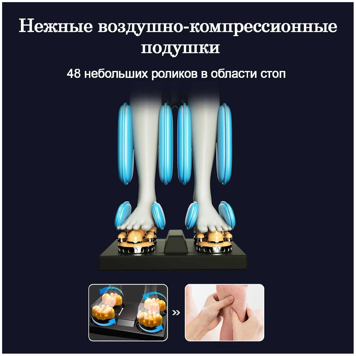 - Продуманный массаж стоп с роликами и воздушными компрессионными подушками: