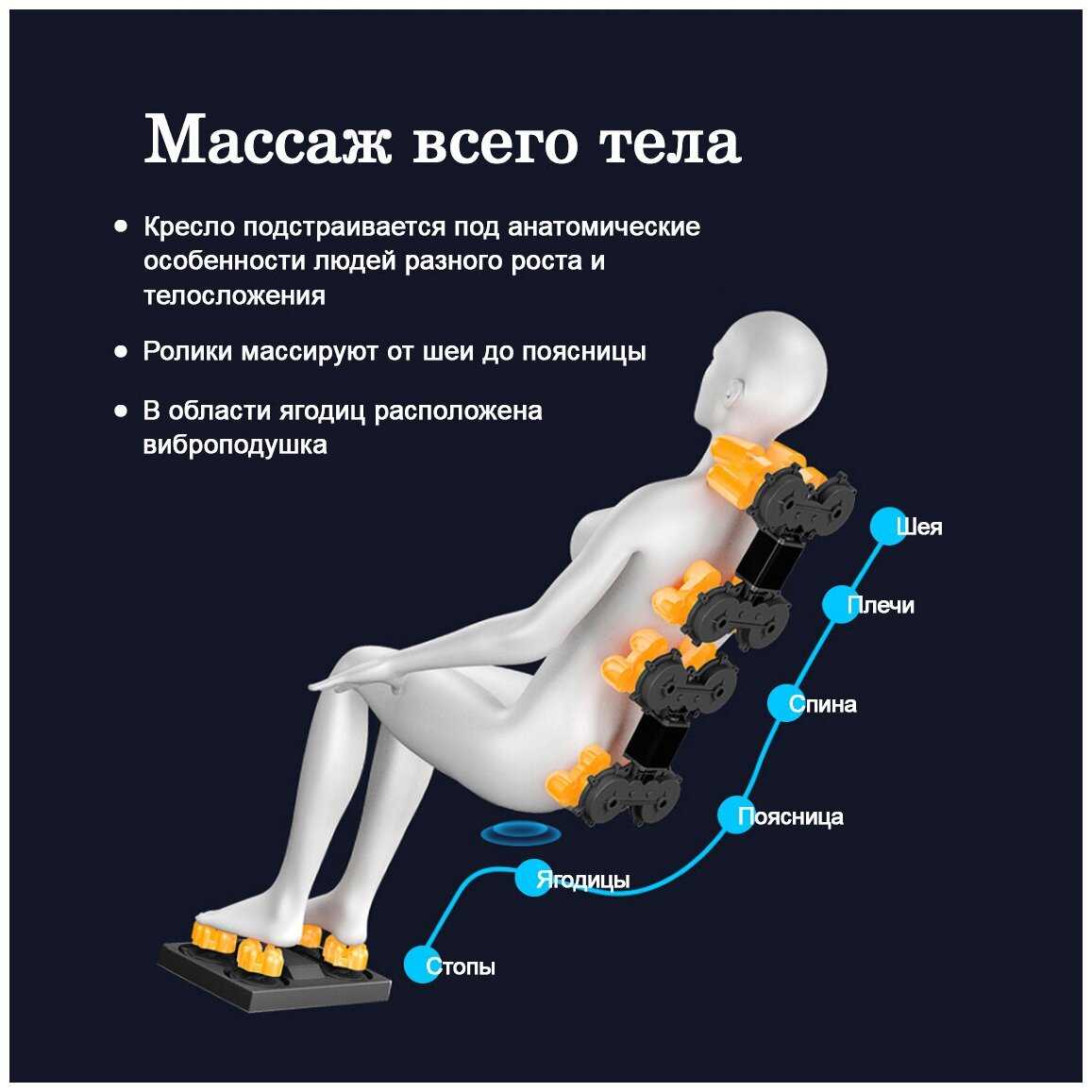 - Эффективный 3D-роликовый массаж спины с регулируемой интенсивностью: