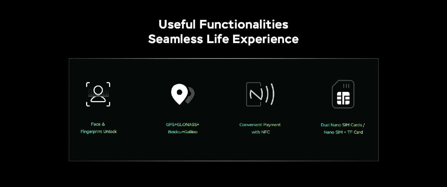 ударопрочный корпус, FM-радио, фонарик, датчик приближения, гироскоп, компас, датчик освещенности, акселерометр