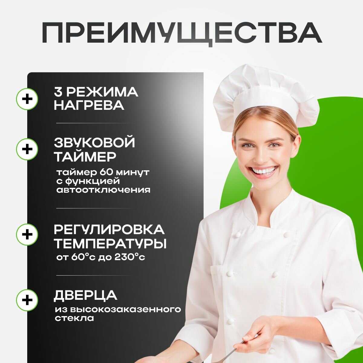 | Режимы работы : | автоматические программы приготовления, верхний нагрев, верхний+нижний нагрев, нижний нагрев |