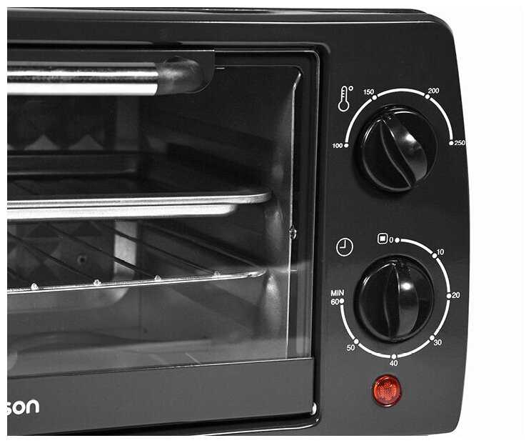 Удобство использования и управление: Управление печью осуществляется двумя механическими переключателями: один регулирует температуру (до 250°C), другой — таймер (до 60 минут). Интерфейс интуитивно понятен и доступен даже подросткам. Отсутствие подсветки внутри камеры затрудняет визуальный контроль за процессом приготовления, но пользователи адаптируются к этому недостатку. Таймер автоматически отключает нагрев по истечении заданного времени, что позволяет безопасно оставлять прибор без присмотра. Отсутствие функции сброса времени требует ручного возврата переключателя в исходное положение, если выставлен избыточный интервал. Габариты печи компактны, она занимает минимум места на кухне и может быть установлена даже на поверхности микроволновой печи. Вес прибора небольшой, что облегчает его перемещение, но усложняет процесс мытья из-за риска выскальзывания из рук. Очистка внутренних поверхностей и аксессуаров не представляет труда, особенно при использовании фольги на противне.
