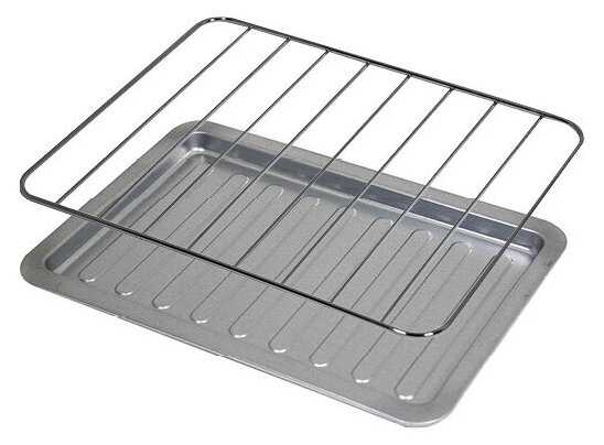 В комплекте противень и решетка.Решетка из блестящего металла, как и в обычной духовке, а противень-оцинкованная сталь, похоже. Понравилось, что противень можно ставить отдельно, а не на решётку, как в некоторых других подобных бюджетных моделях. Но пользуемся в основном решёткой.