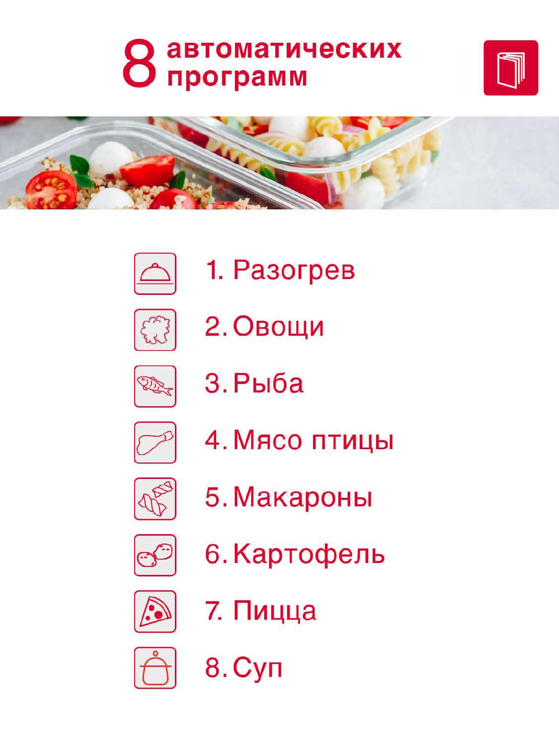 | Дополнительная информация : | отложенный старт, разморозка по весу, индикация времени приготовления, часы |